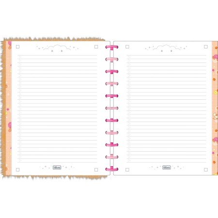 O produto é desenvolvido com capa dura removível de pelúcia, 11 discos coloridos, bolsa plástica, índice, separador de matérias, adesivos para decorar e miolo pautado com 160 folhas, de 90 g/m², soltas que podem ser tiradas e adicionadas quantas vezes quiser.