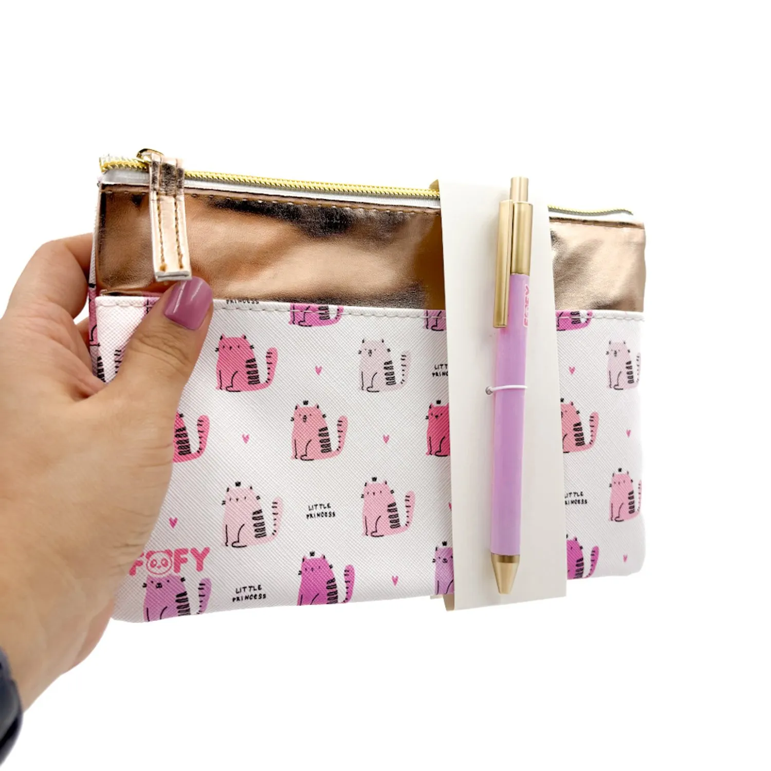 Com design delicado e estampa exclusiva de gatinhos, ele traz 2 peças essenciais para o dia a dia: uma caneta elegante com corpo lilás e detalhes dourados, e uma necessaire com acabamento metalizado rosé. Ideal para quem ama produtos funcionais com um toque de estilo, o kit é perfeito para presentear, organizar o escritório ou complementar kits de papelaria e autocuidado.