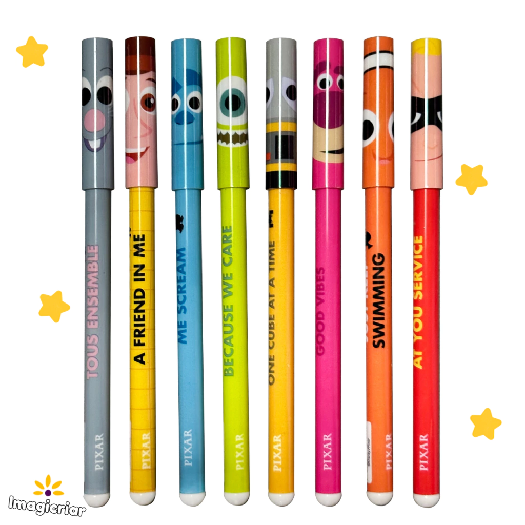 Caneta esferográfica com escrita média 1.0mm na cor preta em todos os modelos, ponta cromada, com tampa e corpinho decorados com personagens e frases de filmes Pixar!